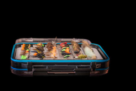 Box with fly-flies on a black background. Fishing equipment.