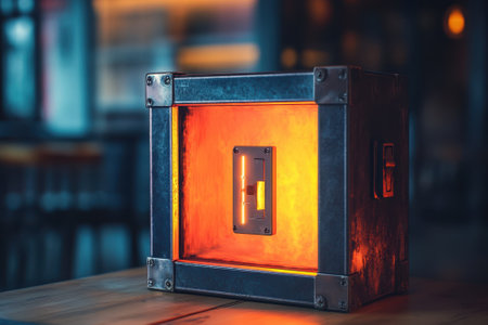A metal box with a warm orange glow sits on a wooden table in a softly lit cafe, creating an inviting ambiance.