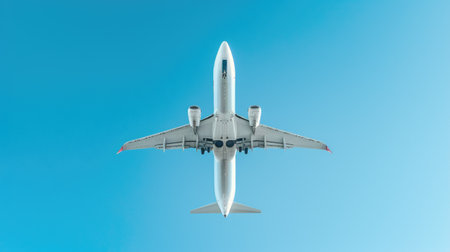 Under view of airplane for commercial passenger or cargo transporation flying on blue sky background with copy space