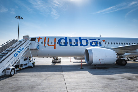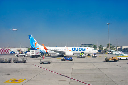 Dubai, UAE - October 2022: Fly Dubai aircraft at Dubai Airport. Flydubai is a low-cost airline in Dubai, United Arab Emirates