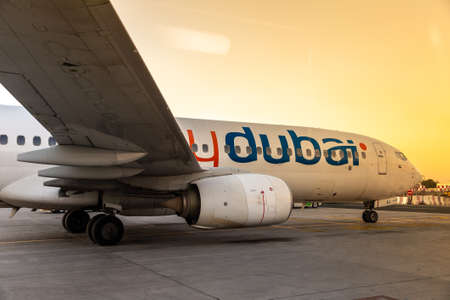 DUBAI, UAE - APRIL 5, 2020: Airplane Flydubai Boeing 737-800 at Dubai International Airport at sunset, Dubai, United Arab Emirates