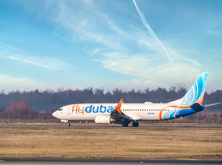 Otopeni, Romania - 01.23.2021: A Fly Dubai Boeing 737-8KN (A6-FEP) airplane on the airport runway at Henri Coanda International Airport.