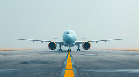 A large wide-body passenger airplane is parked on the airport runway, ready to take off. The plane is isolated on a white background, making it easy to add text or other elements to the image..