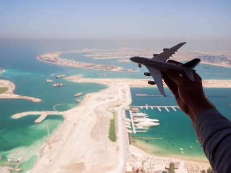 Toy aircraft flies against the backdrop of Palm Jumeirah Island in Dubai. The concept of travel.