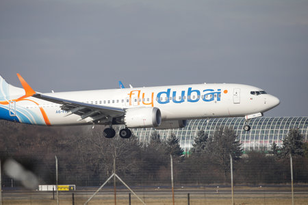 PRAGUE, CZECH REPUBLIC - JANUARY 13: Flydubai Boeing 737-8KN lands to take off from PRG Airport on January 13, 2015. Flydubai is a low-cost airline.
