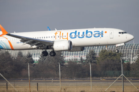 Otopeni, Romania - January 17, 2023: Fly Dubai airline plane landing at the Henri Coanda International Airport.