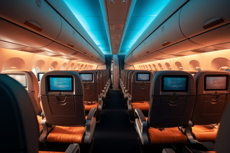 Modern Airplane seats in perspective. Transportation concept. Aircraft's corridor interior in modern