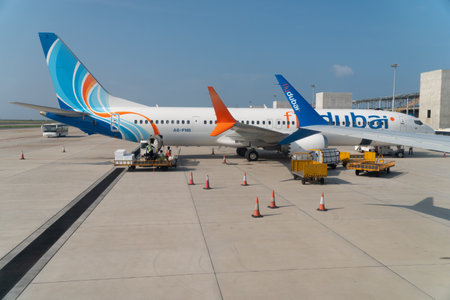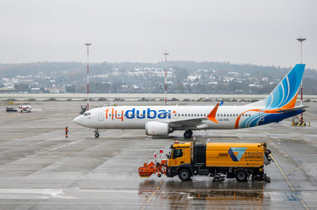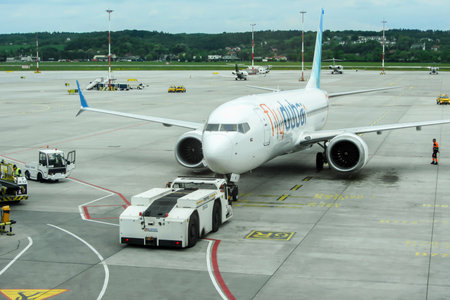 Ivan Paul II Airport, Krakow, Poland - May 07, 2025: Flydubai airplane parked at airport terminal with ground crew preparing for departure, showcasing modern aviation and travel experience