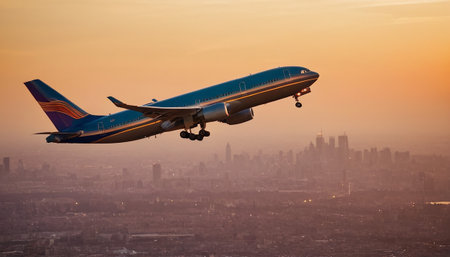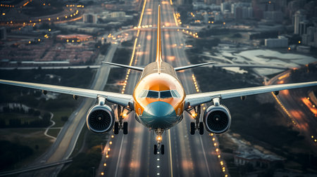An airplane soars above a sprawling cityscape bathed in warm sunlight. The aircraft, featuring wings and engines, is the focal point. Buildings create the background. This image showcases travel and transportation concepts and can be applied in various commercial contexts.