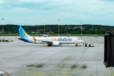 Dubai, United Arab Emirates - May 27, 2021: FlyDubai Boeing 737 MAX 8 airplane at Dubai airport (DXB) in the United Arab Emirates.