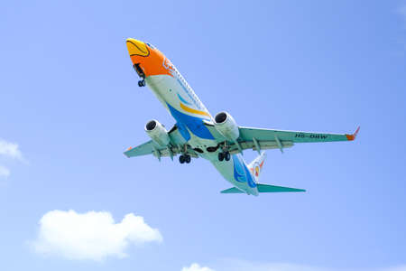 Nonthaburi, Thailand - August 18, 2019 : Closeup passenger airplane is rising into the blue sky.