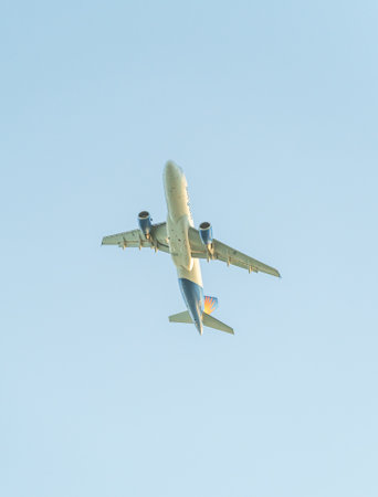 Bucharest, Romania - September 2022: HiSky Airways Airbus A320-200 flying against blue sky. Airplane takes off from Henry Coanda International Airport.