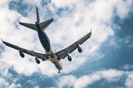 Madrid, Spain; 09-25-2021: Boeing 737 model airplane, from Amazon Air airline, seen with a low angle view shortly after taking off with a cloudy sky behind