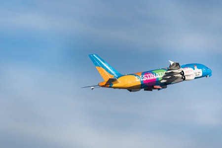 Zurich, Switzerland, January 19, 2023 Emirates Airbus A380-861 aircraft with a special painting is taking off from runway 16