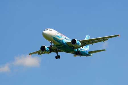 ST. PETERSBURG, RUSSIA - JUNE 29, 2015: Flying the Airbus A319-111 (VQ-BAS) of airline Russia in the color of the football club Zenit