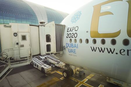 DUBAI - NOV 12: docked Airbus A380 aircraft on November 12, 2014 in Dubai, UAE. Emirates handles major part of passenger traffic and aircraft movements at the airport.