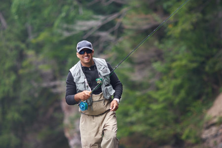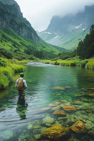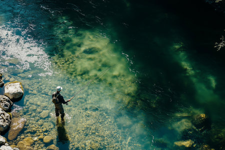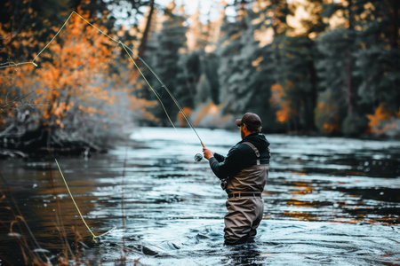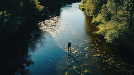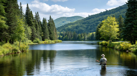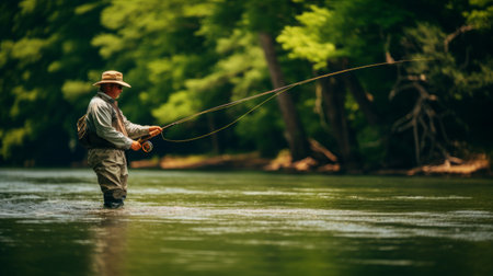 Serene natural setting fly fisherman in river, casting line to catch fish in tranquil environment