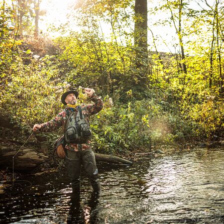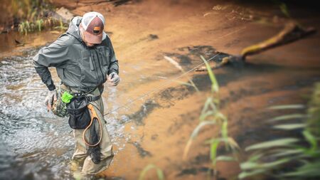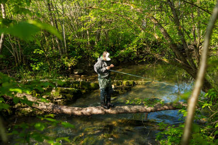 Fishing adventures. Fisherman on a mountain creek fishing for trout. Active sport concept in nature