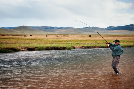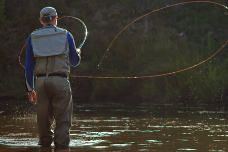 A fisherman fishing with fly fishing. Beautiful cord rings when casting Circle Castes, Voodoo Castes