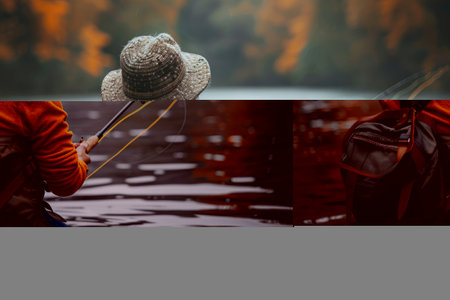 Generative AI, Fishing with rods on autumn landscape near the river, fisherman with spinning, muted colors