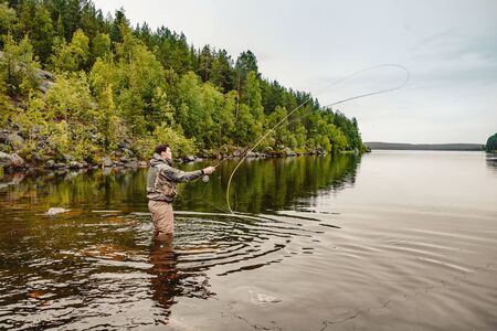 Fly fisherman in river casting line to catch fish in tranquil and picturesque natural environment