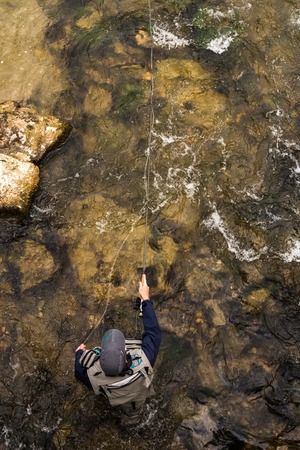 Fly fisherman working the line and the fishing rod while fly fishing on a splendid mountain river for rainbow trout