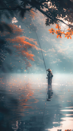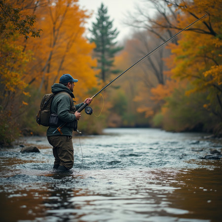 Man fly fishing in a serene river surrounded by autumn foliage in a tranquil landscape during early morning hours