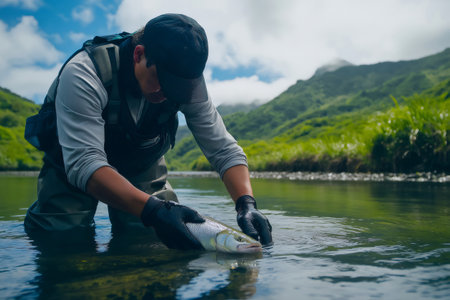 Ichthyologist tagging salmon in a river, collecting vital scientific data for analysis and contributing to research on aquatic ecosystems