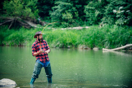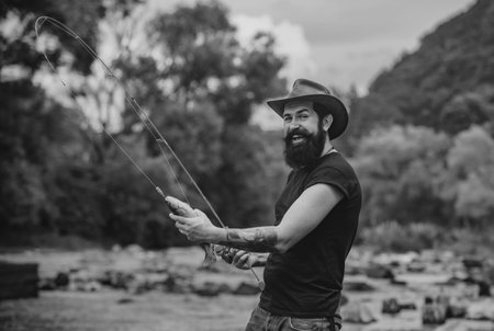 Hipster bearded man catching trout fish. Man with fishing rod, fisherman men in river water outdoor. Summer fishing hobby.