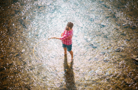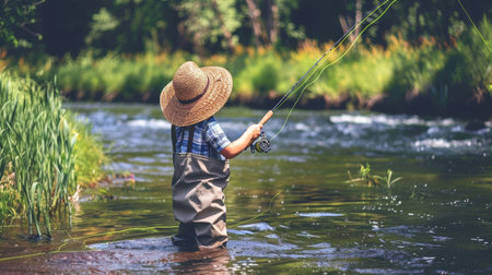 Young Boy in Straw Hat Fly Fishing in a Flowing River, Enjoying Summer Outdoor Activities