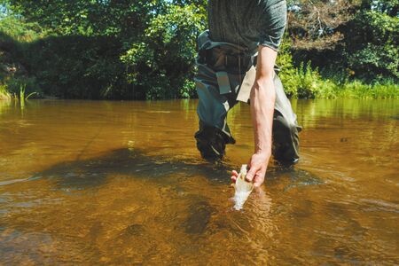 Angler Releasing Brown Trout Into Clear Stream Water in Autumn