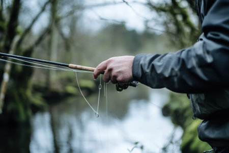 Fishermans seasoned hands skillfully tying a fishing knot, showcasing a detailed view of the line and hook. the blurred backdrop of a tranquil lake adds depth, emphasizing the craft and patience required in fishing.