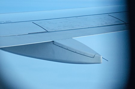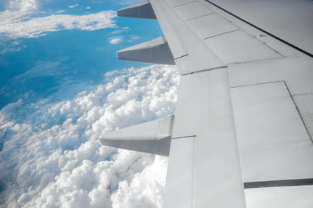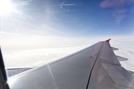View of the wing of an airplane flying above the clouds at high altitude under a blue sky from the passenger window. In flight over Europe. View of jet airplane wing flying in blue sky over clouds.