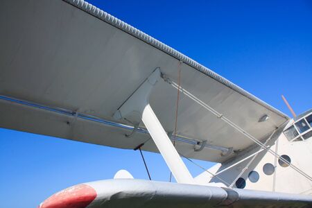 Retro biplane plane in the blue sky. Old airplane against blue sky