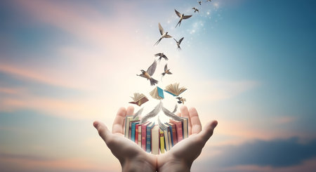 Books flying through a sunny blue sky with scattered clouds, symbolizing freedom, imagination, and the transformative power of knowledge