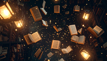 A mystical library features floating books and scattered pages, evoking a sense of enchantment and wonder.