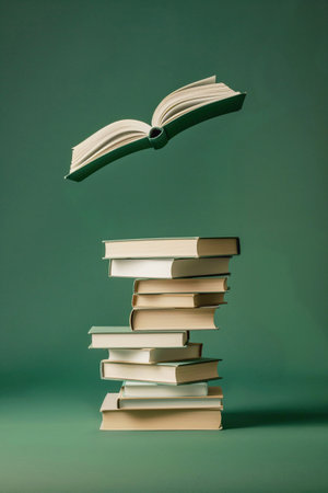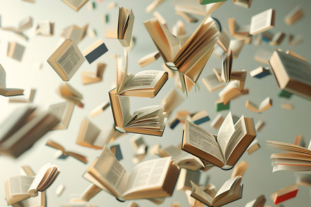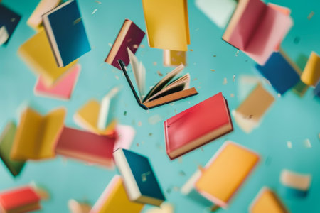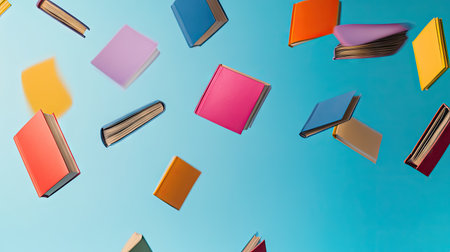 Dynamic composition of multicolored books flying and flipping pages against a clean minimalist background