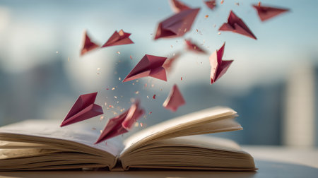 Colorful paper planes made of kind words fly out from an open notebook, showing a moment of creativity and inspiration in a vibrant setting.