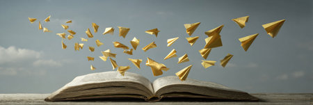 Words transform into paper planes, soaring from an open notebook against a tranquil backdrop, symbolizing creativity and inspiration in motion.