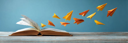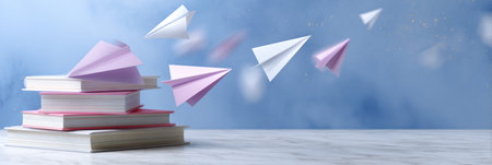 Vibrant paper airplanes are flying above a stack of books on a marble surface, evoking a sense of creativity and imagination in a soft blue environment