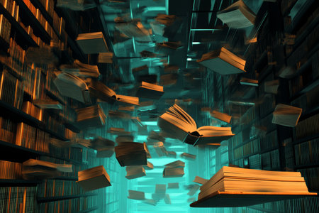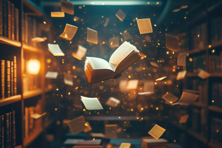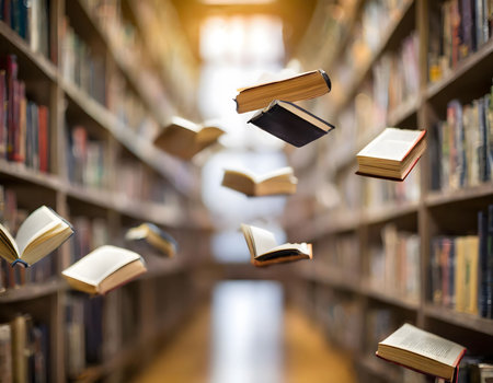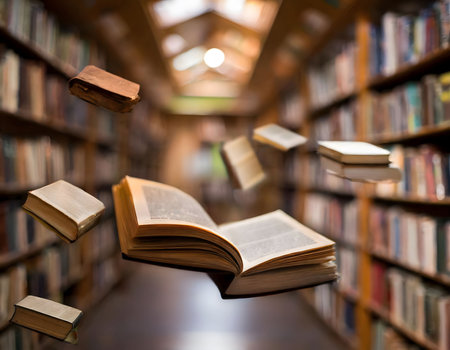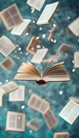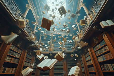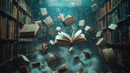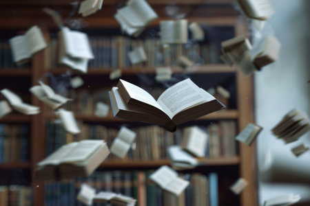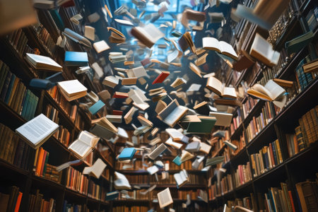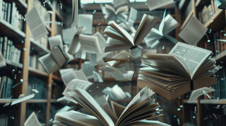 Dynamic Scene of Flying Books and Pages in Motion, Showcasing Library s Intellectual Collection