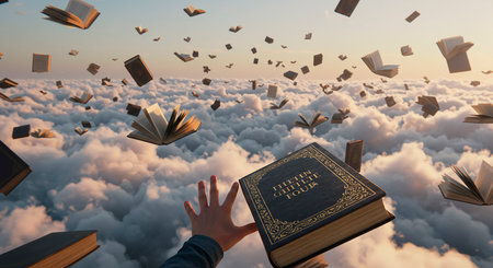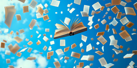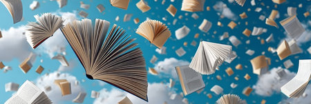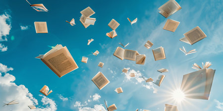 Surreal image of numerous books flying against a bright blue sky with clouds
