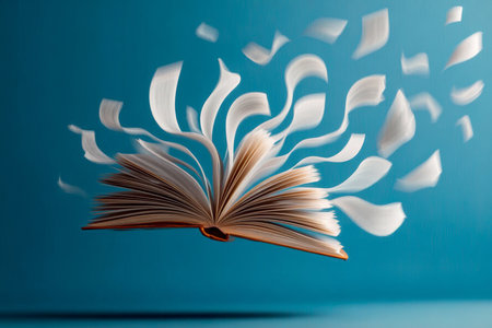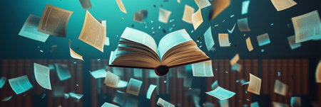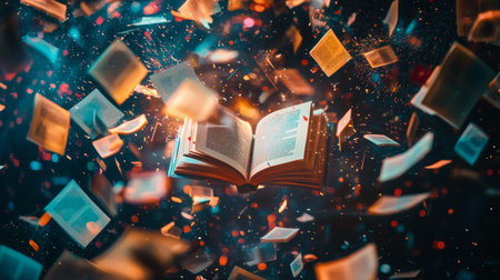 An Open Book with Flying Pages Creates an Abstract Scene Symbolizing Knowledge and Literary Freedom