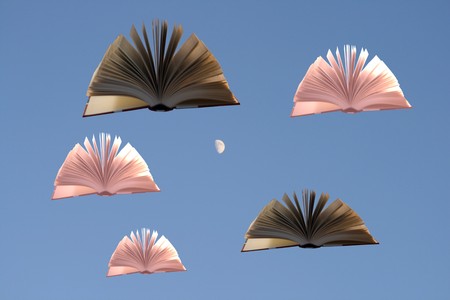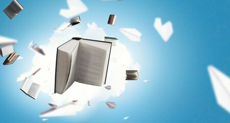books flying over blue sky with clouds