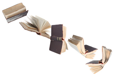 Flying hardcover books on a white background.