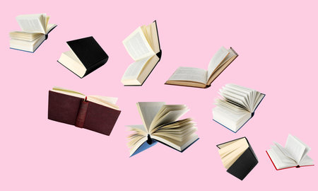 Hardcover books flying like birds against pink background