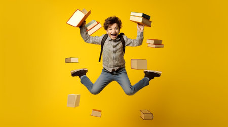 Generative AI : Full body delighted boy in trendy casual clothes smiling and jumping with raised arm while having fun before school studies against yellow backdrop