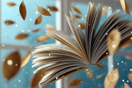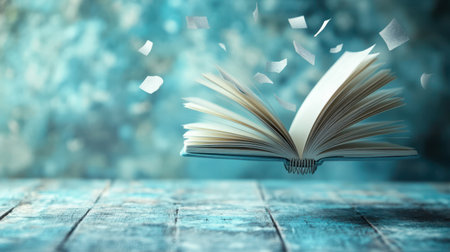 Levitating Literature with Open Book in a Mystical, Floating Composition, Pages, Dreams and Wonders