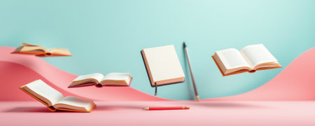 A creative composition of floating books and pencil against pastel background, evoking sense of imagination and inspiration