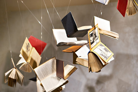 Books hanging in the air as an art object